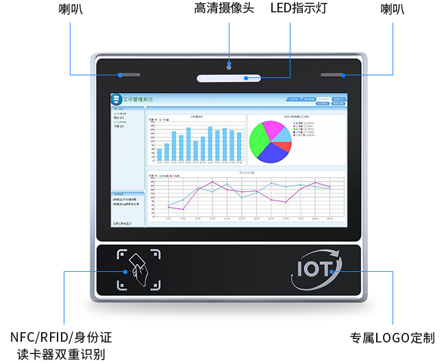 10.1寸安卓工位一体机是产线管理专属设备,整机采用铝合金一体打造,金属拉丝工艺,纯平面板设计,防水防尘,支持NFC读卡识别,可升级IC卡识别、二维码、扫描枪、HDMI输入模块等,满足识别和拓展需要,搭载MES制造管理系统,在智能产线中实现任务浏览、设备管理、缺陷登记、异常警报等功能。